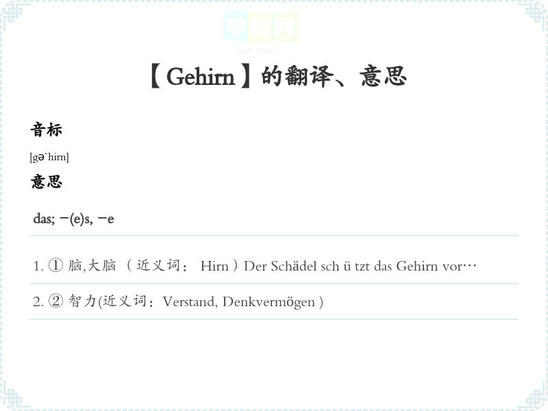 ① 脑,大脑 (近义词: Hirn)Der Schädel schützt das Gehirn vor Verletzungen.颅骨保护大脑免受损伤。