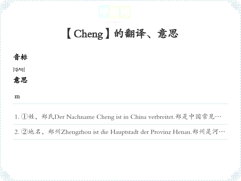①姓,郑氏Der Nachname Cheng ist in China verbreitet.郑是中国常见的姓氏。
