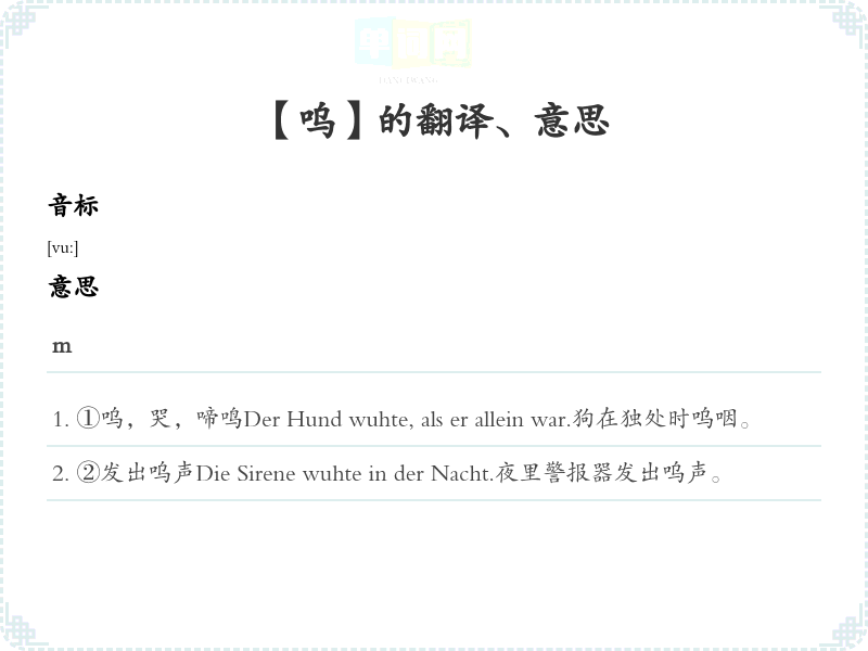 ①呜,哭,啼鸣Der Hund wuhte, als er allein war.狗在独处时呜咽。