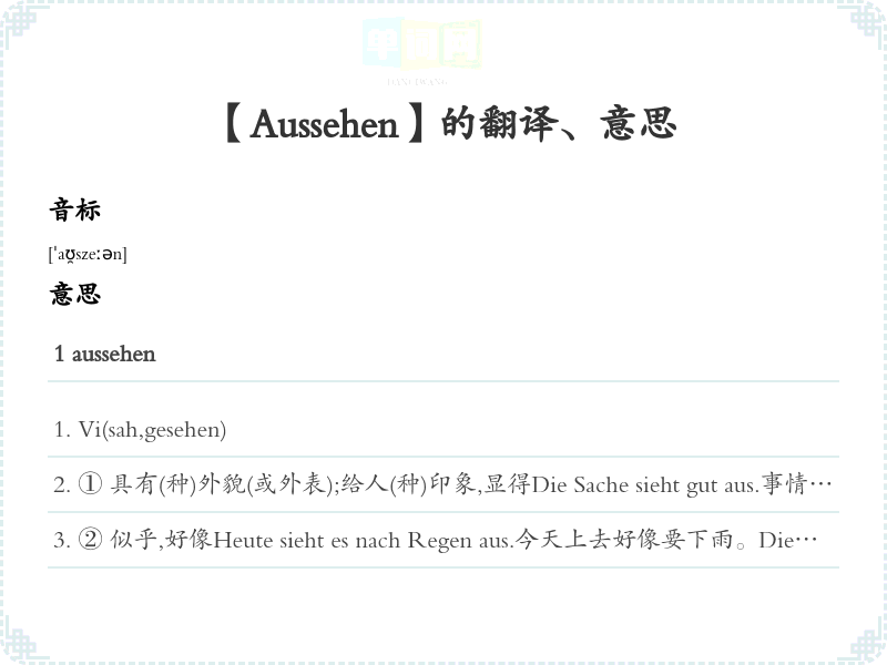 外貌,外观,神情ein gesundes Aussehen 健康的外貌Du solltest die Menschen nicht nach ihrem Aussehen beurteilen.你不该以貌取人.语法搭配+四格, mit+三格, nach+三格, für+四格, +als, +wie