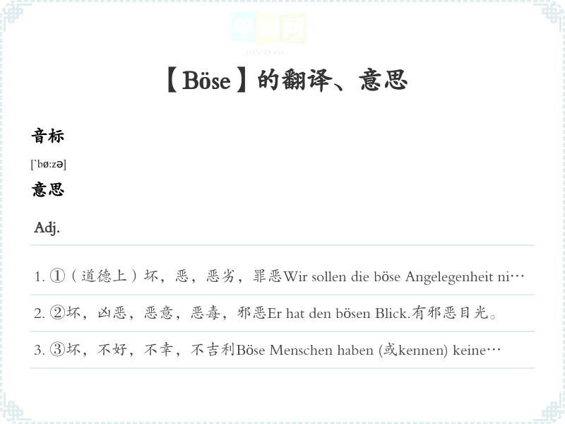 ②坏,凶恶,恶意,恶毒,邪恶Er hat den bösen Blick.有邪恶目光。