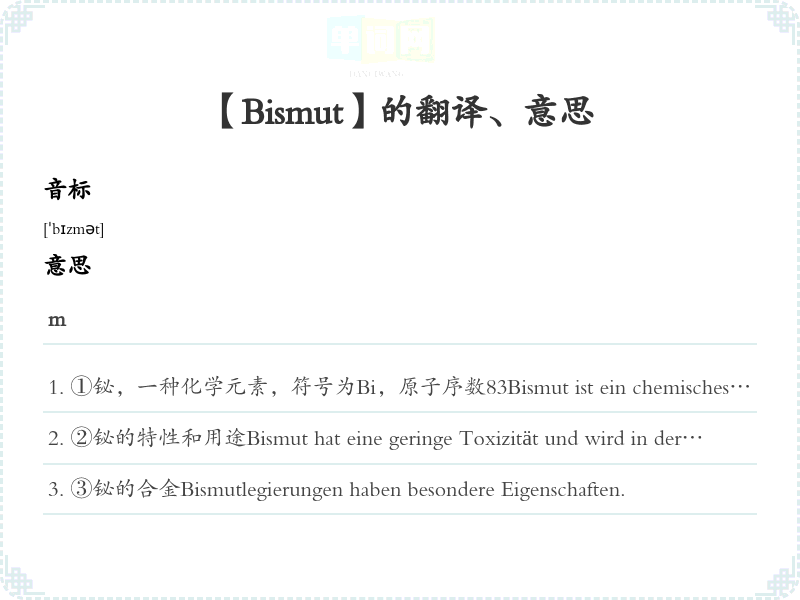 ①铋,一种化学元素,符号为Bi,原子序数83Bismut ist ein chemisches Element mit dem Symbol Bi und der Ordnungszahl 83.