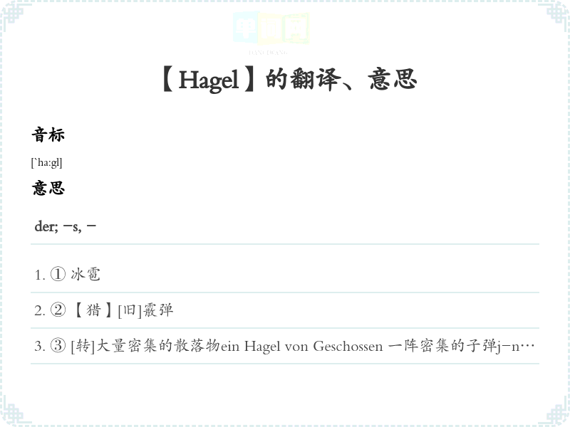 ③ [转]大量密集的散落物ein Hagel von Geschossen 一阵密集的子弹j-n mit einem Hagel von Schimpfwörtern überschütten 把某人臭骂一