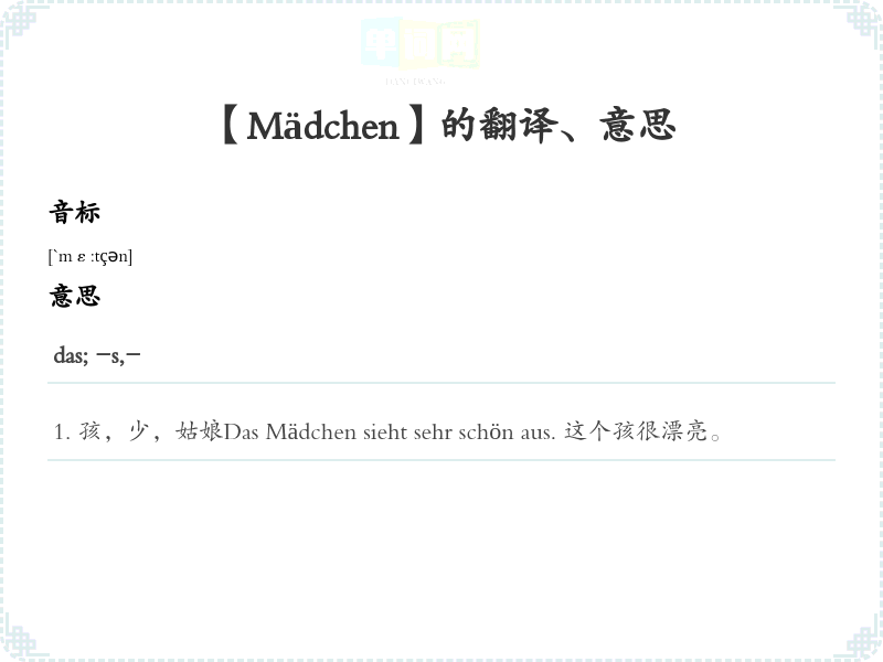 孩,少,姑娘Das Mädchen sieht sehr schön aus. 这个孩很漂亮。