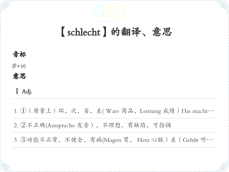 ①(质量上)坏,次,劣,差( Ware 商品,Leistung 成绩)Das macht einen schlechten Eindruck.这给人一个坏印象。