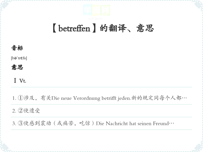 ①涉及,有关Die neue Verordnung betrifft jeden.新的规定同每个人都有关。Das betrifft mich überhaupt nicht.这与我根本不相干。