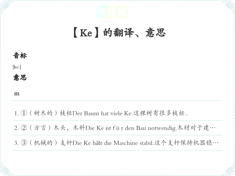 ①(树木的)枝桠Der Baum hat viele Ke.这棵树有很多枝桠。