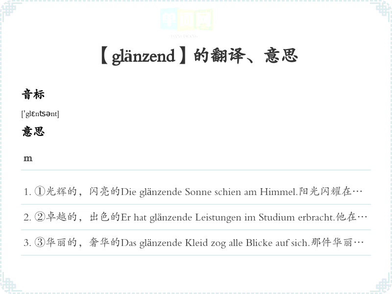 ②卓越的,出色的Er hat glänzende Leistungen im Studium erbracht.他在学习上取得了出色的成绩。