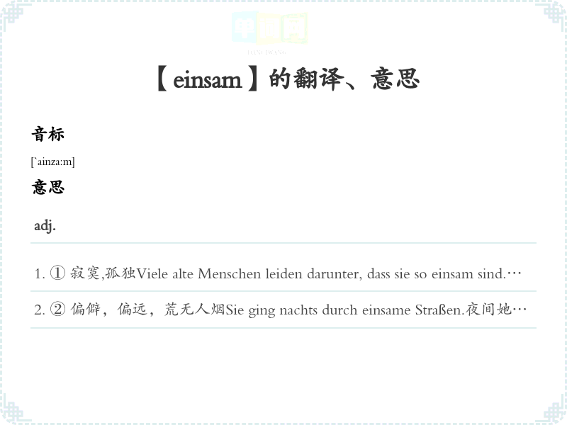 ① 寂寞,孤独Viele alte Menschen leiden darunter, dass sie so einsam sind.许多老人因孤独而痛苦。