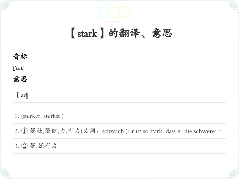 ① 强壮,强健,力,有力(义词:schwach )Er ist so stark, dass er die schwere Kiste allein tragen kann .他很有力,那么沉重箱子都搬得起来。