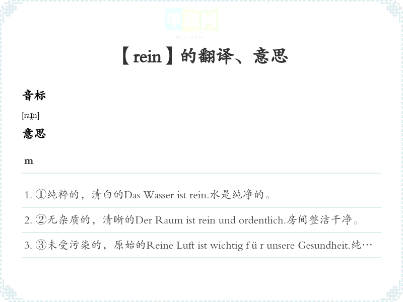 ①纯粹的,清白的Das Wasser ist rein.水是纯净的。