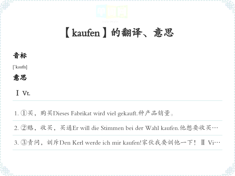 ③责问,训斥Den Kerl werde ich mir kaufen!家伙我要训他一下!Ⅱ Vi.买Bei wem kaufen Sie?您在哪家商店买东西?语法搭配+四格, sich+三格, sich+四格, +三格, mit+三格, von+三格, bei+三格