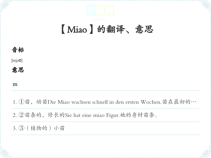 ②苗条的,修长的Sie hat eine miao Figur.她的身材苗条。