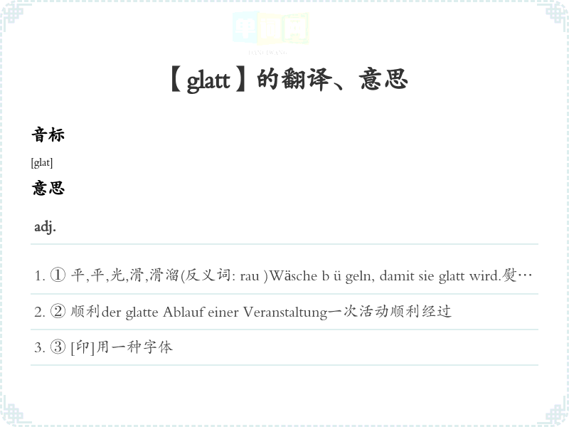 ⑦ <加强语气> (义词:schlichtweg)加强语气>Stell dir vor, er hat das glatt geglaubt! 你猜怎么着,他居然全信了。