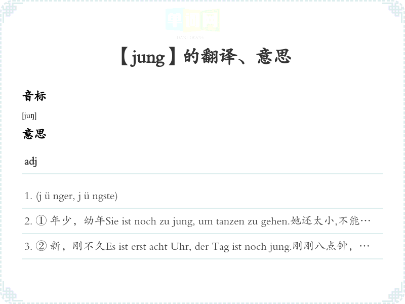 ② 新,刚不久Es ist erst acht Uhr, der Tag ist noch jung.刚刚八点钟,还。Sie sind jung verheiratet - sie haben erst vor zwei Wochen geheiratet.他们新婚——两星期前才接婚。