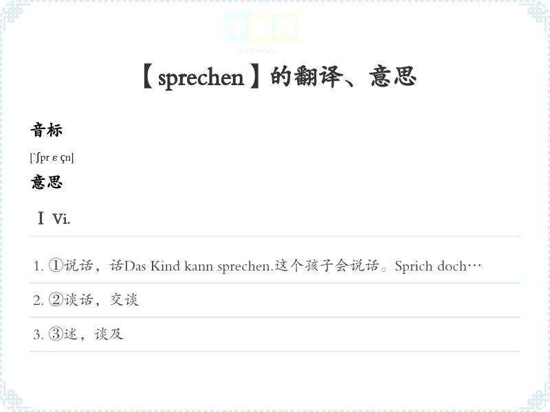 ①说话,话Das Kind kann sprechen.这个孩子会说话。Sprich doch deutlich!说清楚点!Er spricht mit französischem Akzent.他说话带有法国口音。