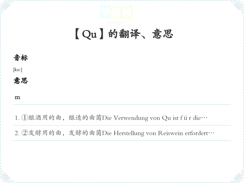 ①酿酒用的曲,酿造的曲菌Die Verwendung von Qu ist für die Bierherstellung entscheidend.使用曲子酿造啤酒至关重要。