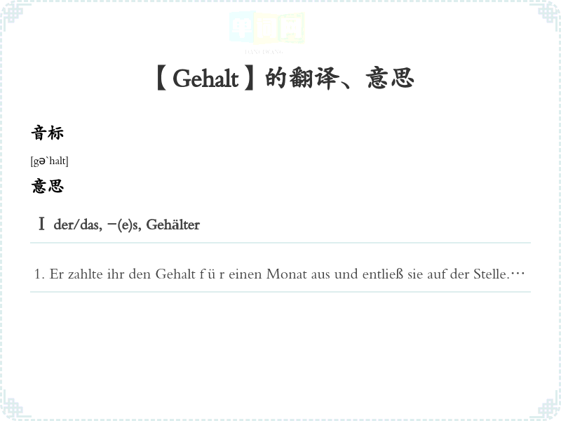 Er zahlte ihr den Gehalt für einen Monat aus und entließ sie auf der Stelle.他付了她一个月的工资,然后当场解雇了她。Ⅱ der. -(e)s, -e(多用单数)Der Gehalt an Eisen in diesem Erz ist gering.这种矿山中铁的含量很小。