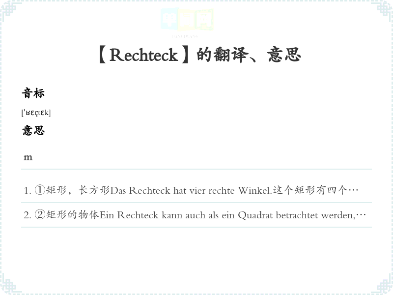①矩形,长方形Das Rechteck hat vier rechte Winkel.这个矩形有四个直角。