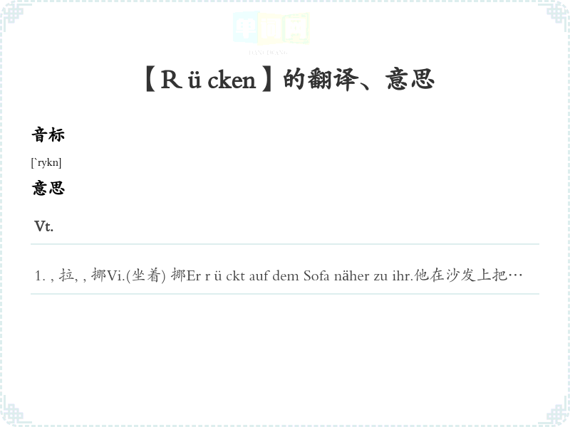 , 拉, , 挪Vi.(坐着) 挪Er rückt auf dem Sofa näher zu ihr.他在沙发上把身子挪近她一些。ein Ziel rückt in weite Ferne/in greifbare Nähe目标难以实现/即将实现语法搭配sich+四格, +四格, auf+四格, von+三格, an+四格 欧 路 软 件