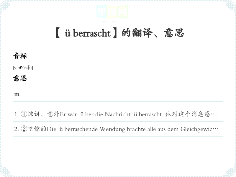 ①惊讶,意外Er war über die Nachricht überrascht. 他对这个消息感到惊讶。