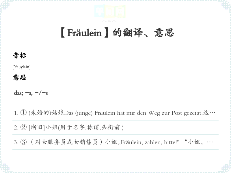① (未婚的)姑娘Das (junge) Fräulein hat mir den Weg zur Post gezeigt.这位(年轻)小姐给我去邮局的路。