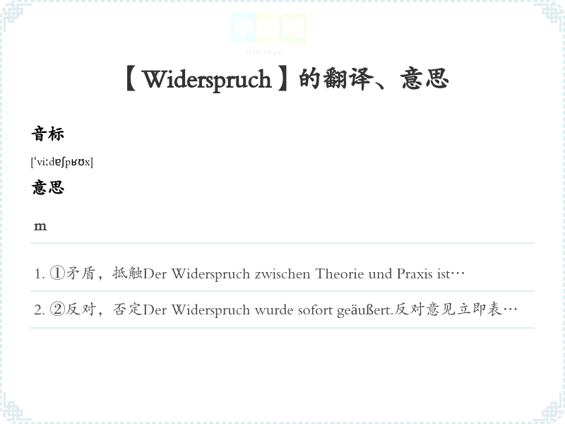 ①矛盾,抵触Der Widerspruch zwischen Theorie und Praxis ist offensichtlich.理论与实践之间的矛盾显而易见。