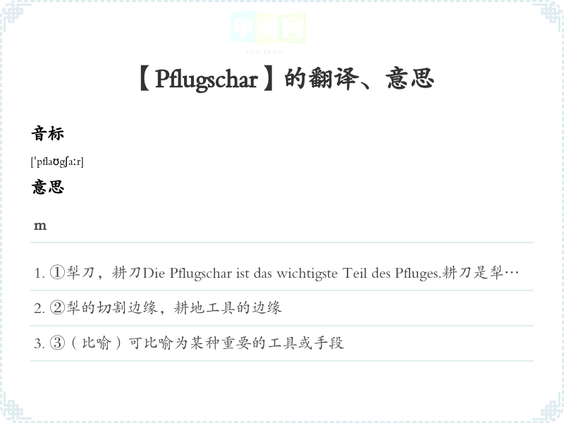 ①犁刀,耕刀Die Pflugschar ist das wichtigste Teil des Pfluges.耕刀是犁的最重要部分。
