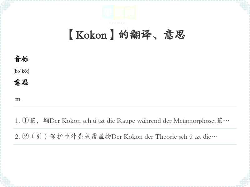 ②(引)保护性外壳或覆盖物Der Kokon der Theorie schützt die Gedanken vor äußeren Einflüssen.理论的茧保护思想不受外部影响。