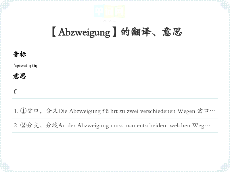 ①岔口,分叉Die Abzweigung führt zu zwei verschiedenen Wegen.岔口通向两个不同的道路。