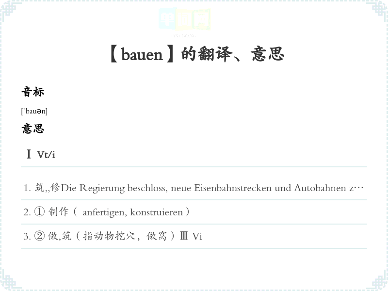 筑,,修Die Regierung beschloss, neue Eisenbahnstrecken und Autobahnen zu bauen.政府决定修新的铁路线和高速公路。Ⅱ Vt