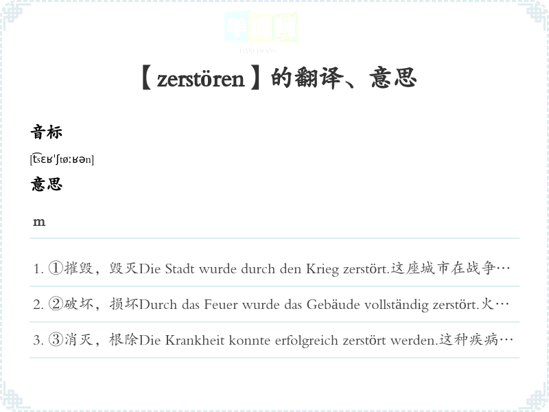 ①摧毁,毁灭Die Stadt wurde durch den Krieg zerstört.这座城市在战争中被摧毁。
