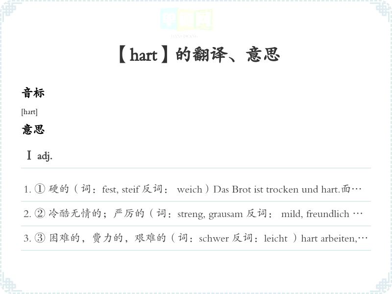 ② 冷酷无情的;严厉的(词:streng, grausam 反词: mild, freundlich )Die vielen Enttäuschungen haben ihn hart gemacht.太多失望使变得冷酷无情。