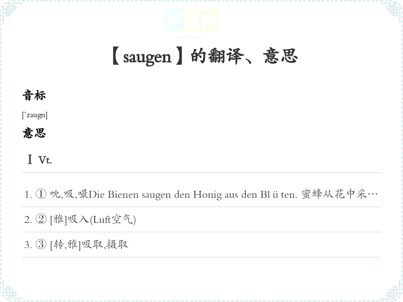 吮吸,嘬,抽,吸Das Baby saugt an seinem Daumen.婴儿嘬自己的指头。Ⅲ Vr.吸取;渗透Der Schwamm hat sich voll Wasser gesogen.海绵吸足了水。语法搭配sich, +四格, an+三格, aus+三格