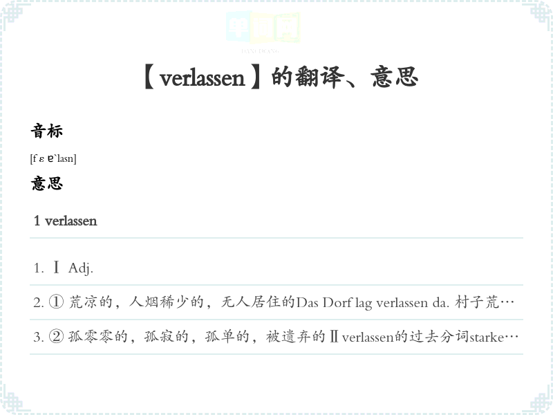 ② 孤零零的,孤寂的,孤单的,被遗弃的Ⅱverlassen的过去分词starkes Verb 强变化动词2 verlassen