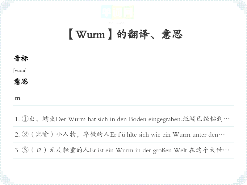 ②(比喻)小人物,卑微的人Er fühlte sich wie ein Wurm unter den anderen.他觉得自己在其他人中就像个卑微的小人物。
