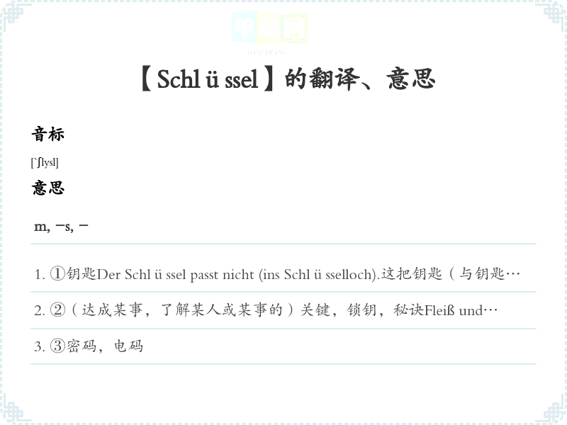 ②(达成某事,了解某人或某事的)关键,锁钥,秘诀Fleiß und Umsicht sind der Schlüssel zum Erfolg.成功的关键在于勤奋与审慎。Hier liegt der Schlüssel zu diesem Geheimnis.揭这难题之谜的关键便在这里。