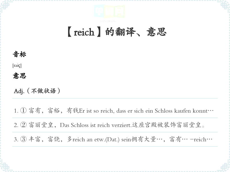 ③ 丰富,富饶,多reich an etw.(Dat.) sein拥有大量…,富有… -reich (做后缀,构成形容词)(含)…多,…丰富vitaminreich维生素丰富schneereich多雪