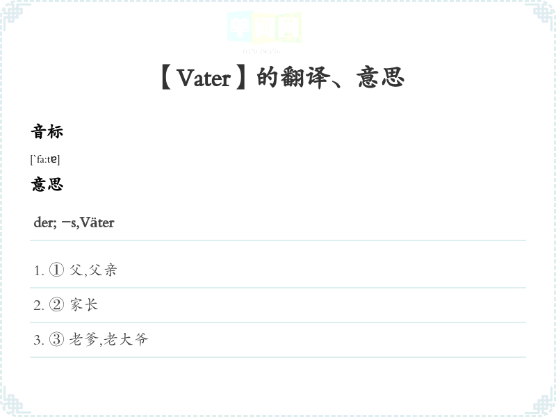 ⑤ 创始人,创造者,创导者,鼻祖der Vater einer Idee 一种思想创始人