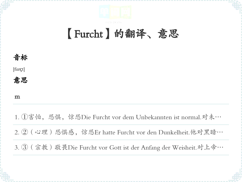 ①害怕,恐惧,惊恐Die Furcht vor dem Unbekannten ist normal.对未知的恐惧是正常的。