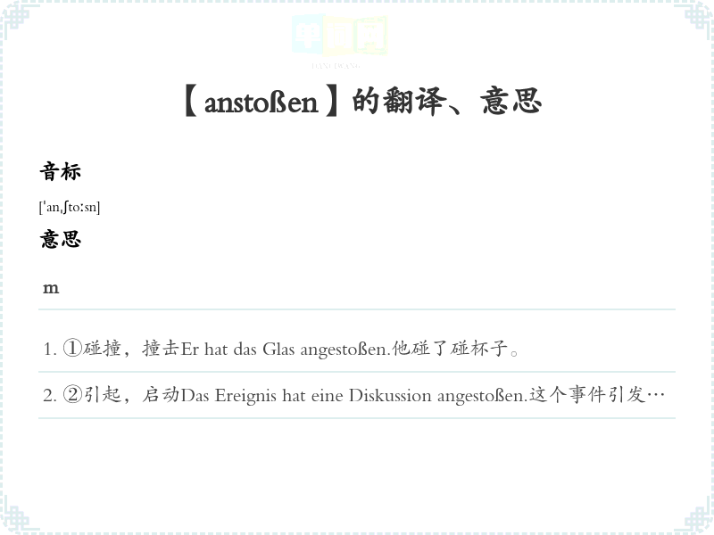 ①碰撞,撞击Er hat das Glas angestoßen.他碰了碰杯子。