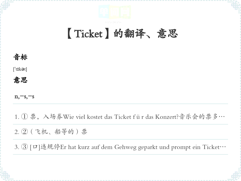 ① 票,入场券Wie viel kostet das Ticket für das Konzert?音乐会的票多少钱?