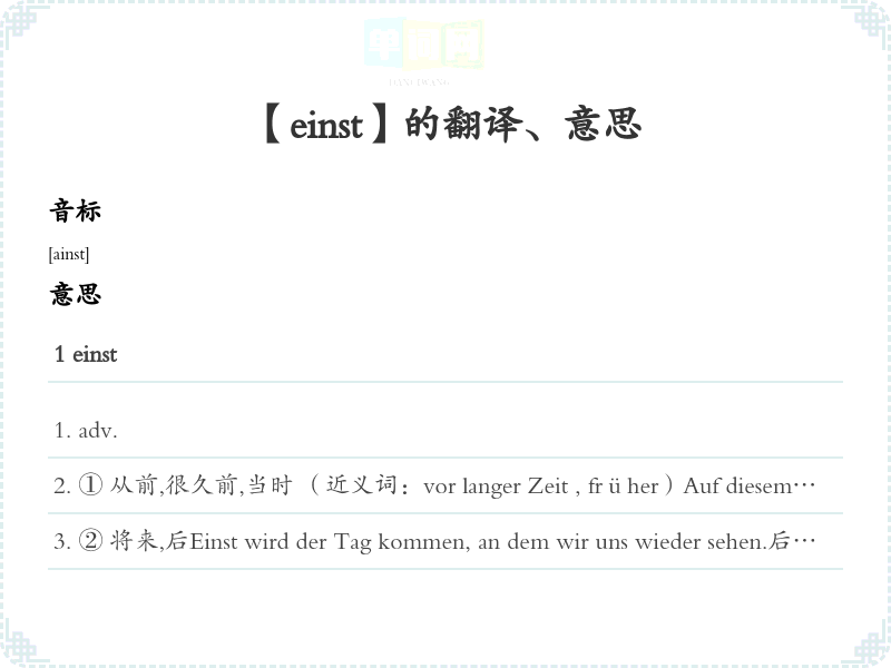② 将来,后Einst wird der Tag kommen, an dem wir uns wieder sehen.后我们见面的日子还会到来的。2 Einstdas; -, nur Sg过去das Einst und das Jetzt 过去和现在
