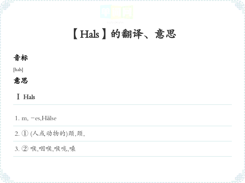 ⑤ [猎](猎犬的吠声)Ⅱ Halsm, -es,-en[海员用语]