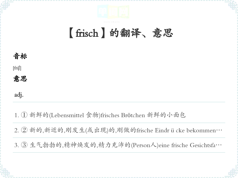 ③ 生气勃勃的,精神焕发的,精力充沛的(Person人)eine frische Gesichtsfarbe 健康的面色Wollen Sie sich frisch machen? 您要一吗?(指脸、)