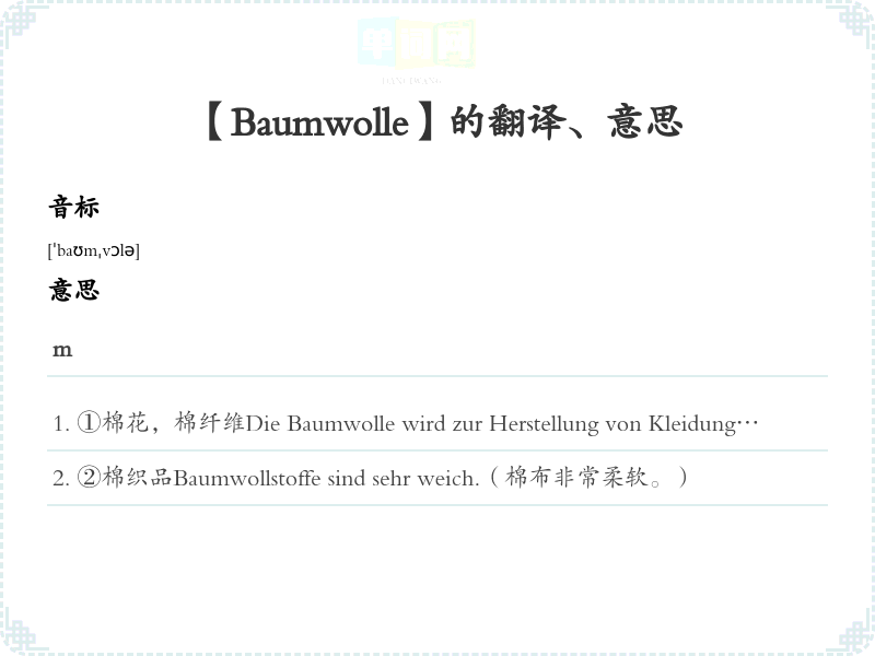 ①棉花,棉纤维Die Baumwolle wird zur Herstellung von Kleidung verwendet.(棉花用于制作衣物。)