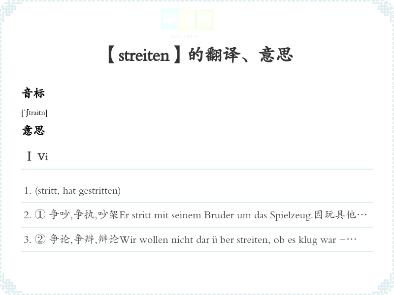 ① 争吵,争执,吵架Er stritt mit seinem Bruder um das Spielzeug.因玩具他和他兄弟发生了争吵。Sie streiten immer wieder darüber, wer aufräumen muss.他们收拾房子而争吵。
