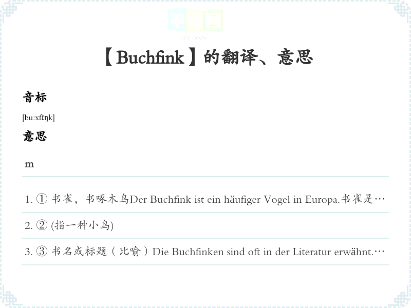 ③ 书名或标题(比喻)Die Buchfinken sind oft in der Literatur erwähnt.书雀常常在文学中被提及。