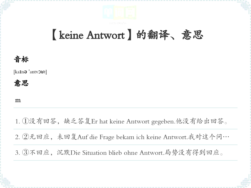 ②无回应,未回复Auf die Frage bekam ich keine Antwort.我对这个问题没有得到回应。