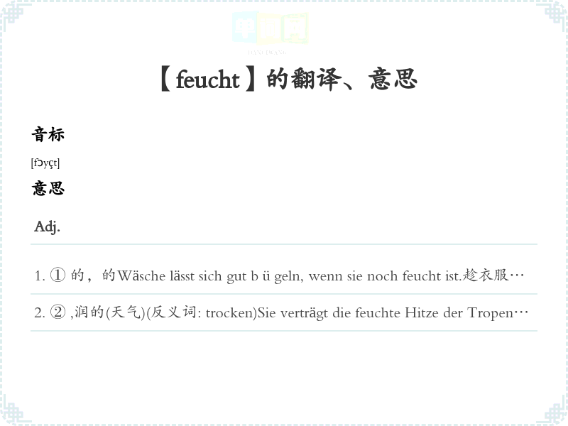 ② ,润的(天气)(反义词: trocken)Sie verträgt die feuchte Hitze der Tropen nicht .她受不了热带的炎热。